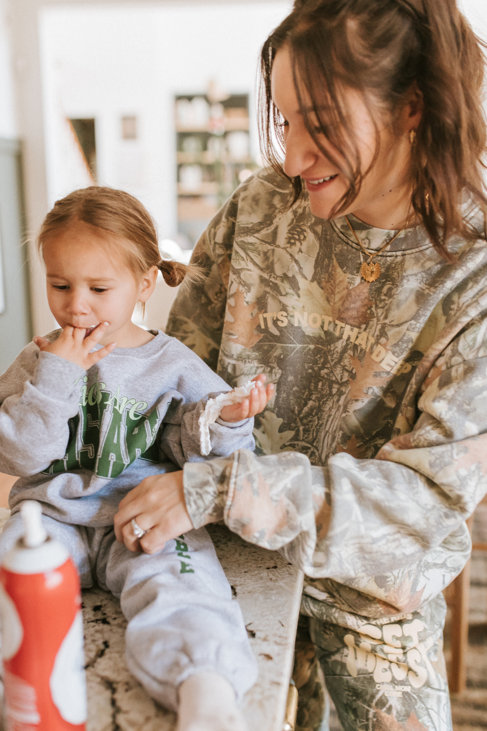 Because motherhood isn’t meant to be spotless. This premium camo crewneck is your reminder to loosen up, laugh through the chaos, and let the kids get messy — literally. Made from soft, heavyweight fabric with a relaxed, cozy fit that feels lived-in from day one.